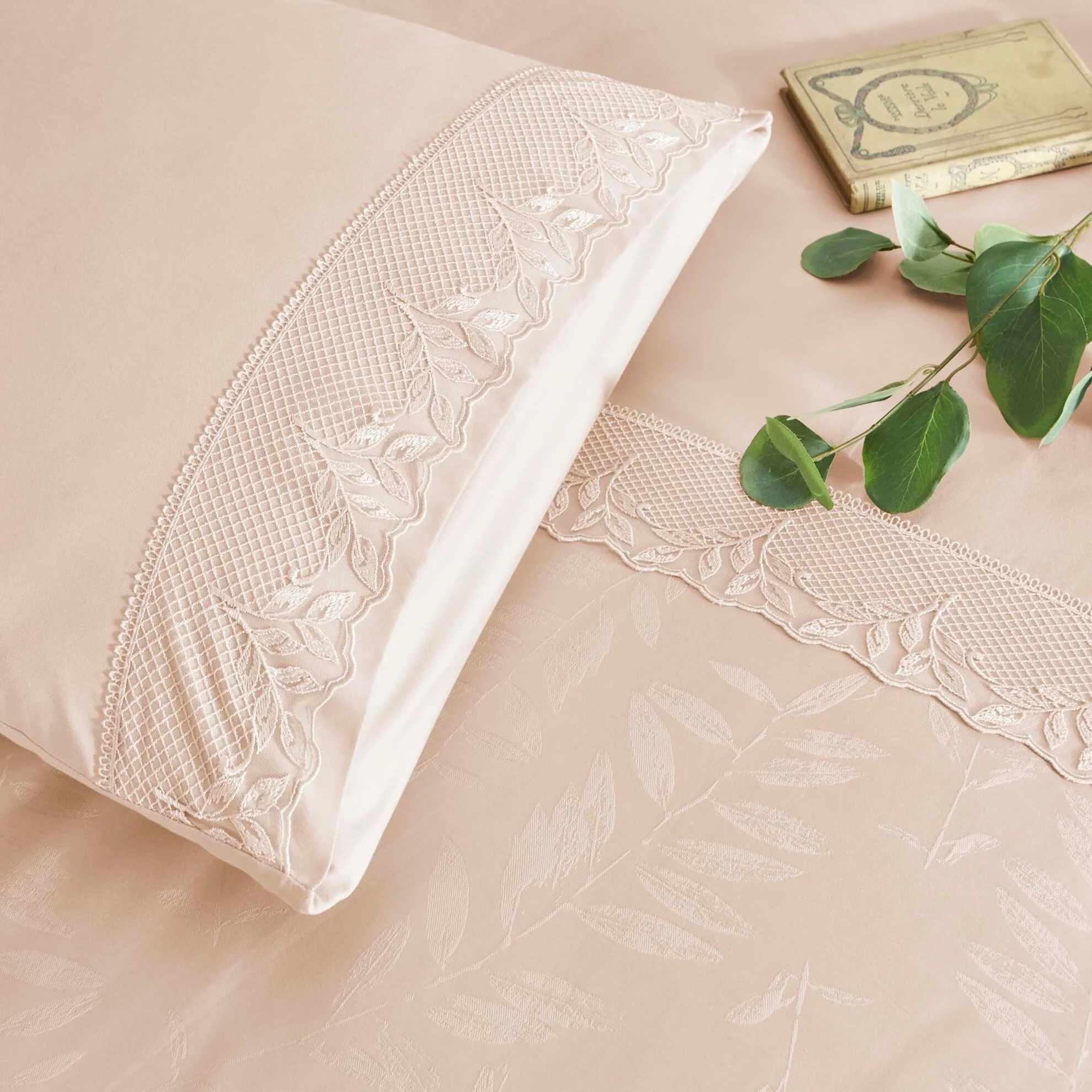 Lenjerie De Pat Ecru Cu Dantela Sambre TAC Bumbac Natural Dublu Satinat Design Modern Antisifonare Cadou Elegant