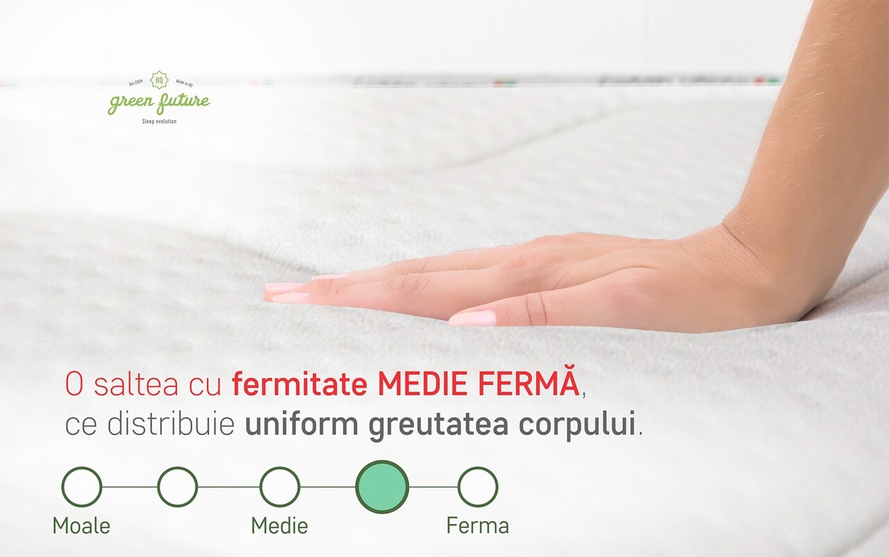 Stratul de confort al saltelei este format din spuma elastica Green Form HD® cu celulatie deschisa si 3 cm spuma Green Therm Memory® care se muleaza pe corp eliminand punctele de presiune in timpul somnului pentru a relaxa muschii si a asigura o circulatie sangvina sanatoasa.