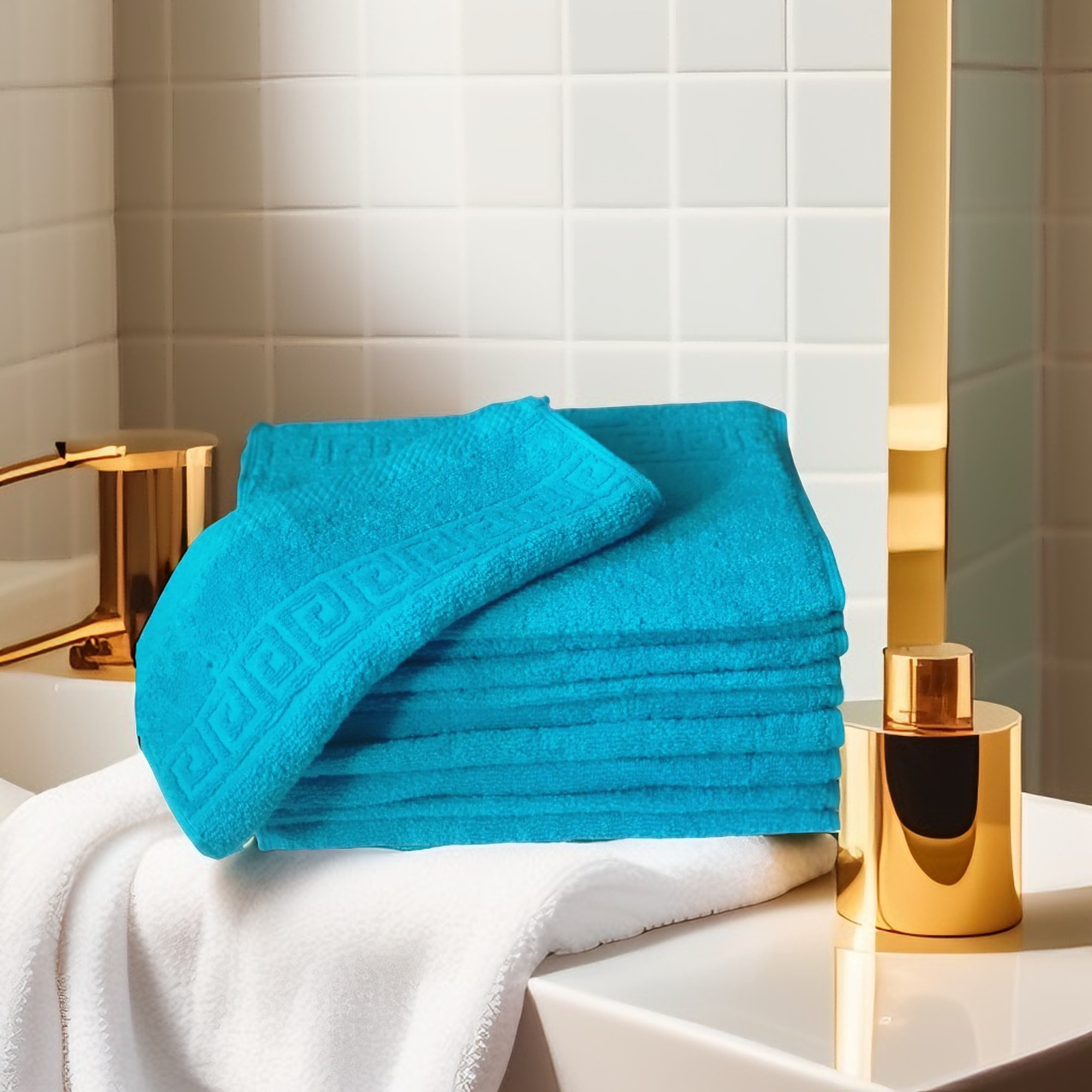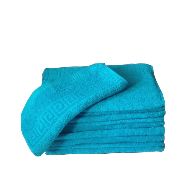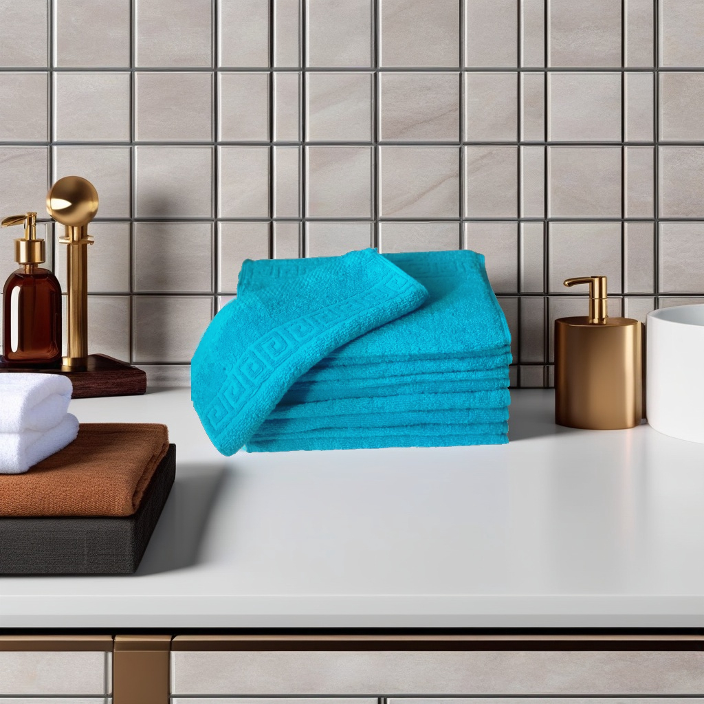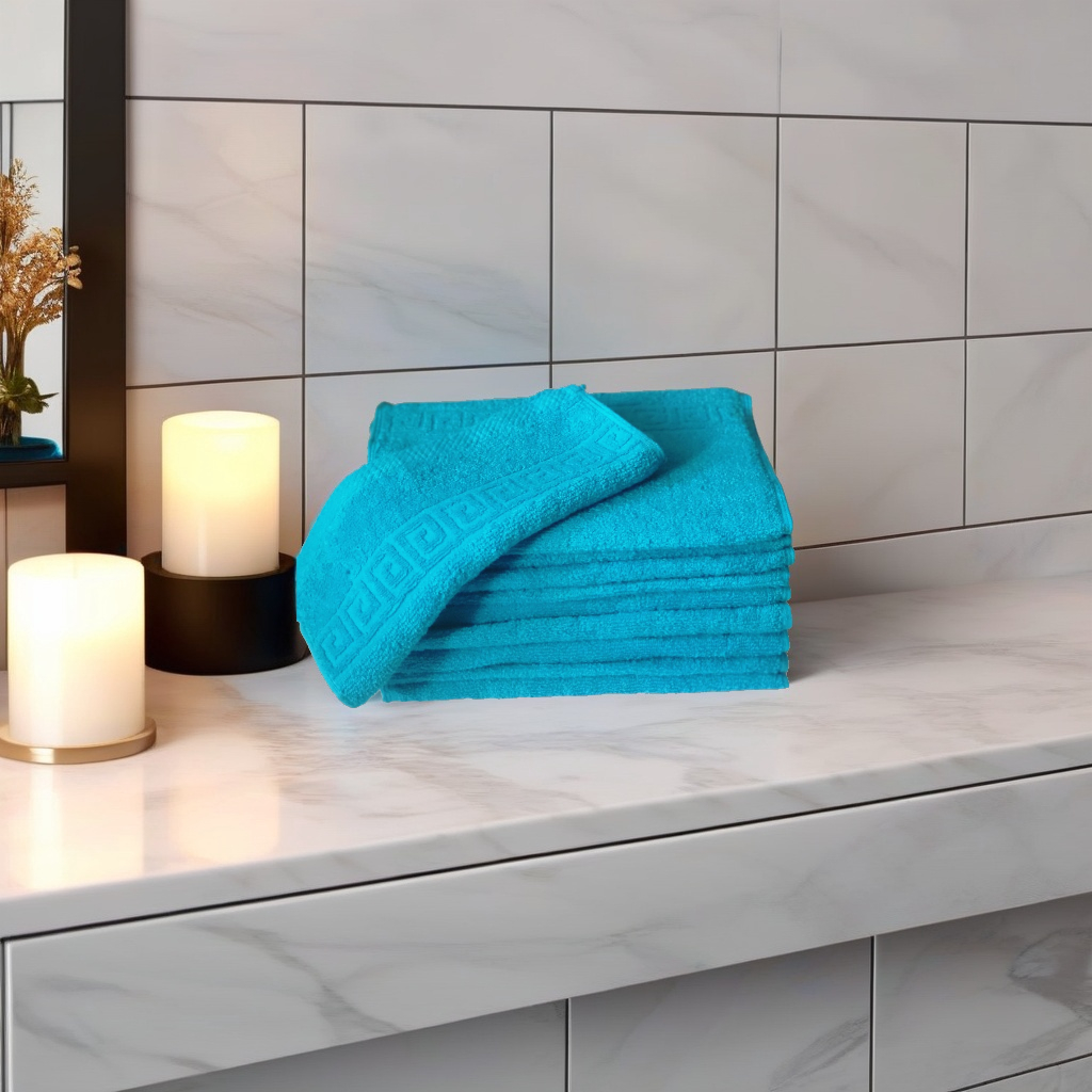 Alege setul nostru de 10 prosoape hoteliere 30x50cm bumbac pakistanez 500 g/mp Greek Border Turcoaz pentru a adăuga un plus de confort și eleganță în baia ta. Cu o combinație perfectă de calitate, durabilitate și design rafinat, aceste prosoape sunt alegerea ideală pentru cei care apreciază lucrurile de calitate. Comandă acum și bucură-te de experiența unui prosop de lux la un preț accesibil!