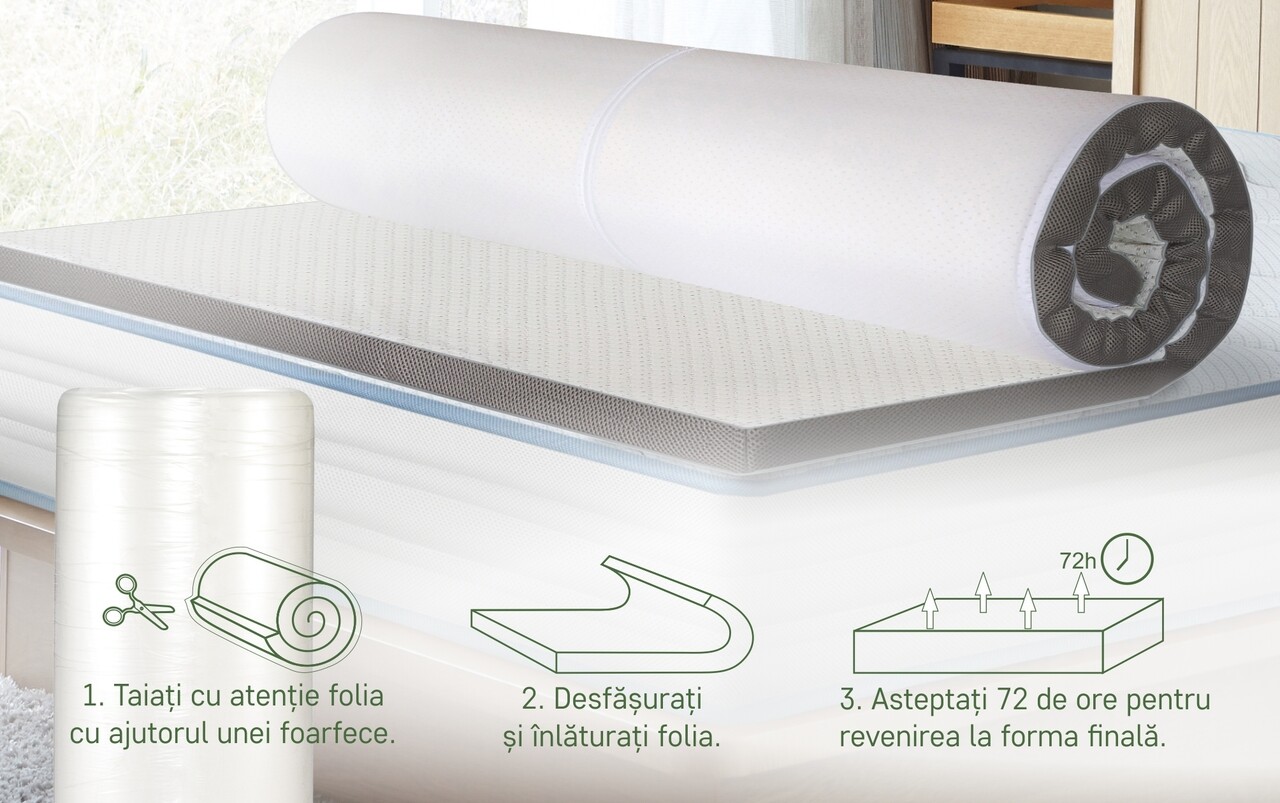 – desfaceti cu grija folia de protectie, fara a folosi cutitul sau alte obiecte taioase care ar putea deterioara tesatura topper-ului.